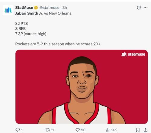 这场比赛小贾32分是赛季新高,他延续了生涯的一场纪录,那就是进入联盟后他每一个赛季都至少拿到一场30+,除此之外7个三分球也是小贾生涯新高,小贾本赛季拿下20+时火箭拿下5胜2负。
