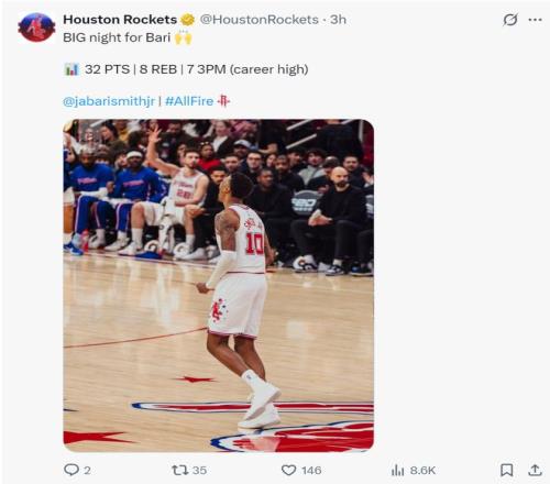 这场比赛小贾巴里-史密斯是全队最高光的一个,他在末节命中第二个三分球时怒吼释放,这场比赛对他来说算是扫去阴霾的一战,因为上一场小贾12中3,对阵雷霆一战15中3,小贾进入1月后状态下滑非常严重。